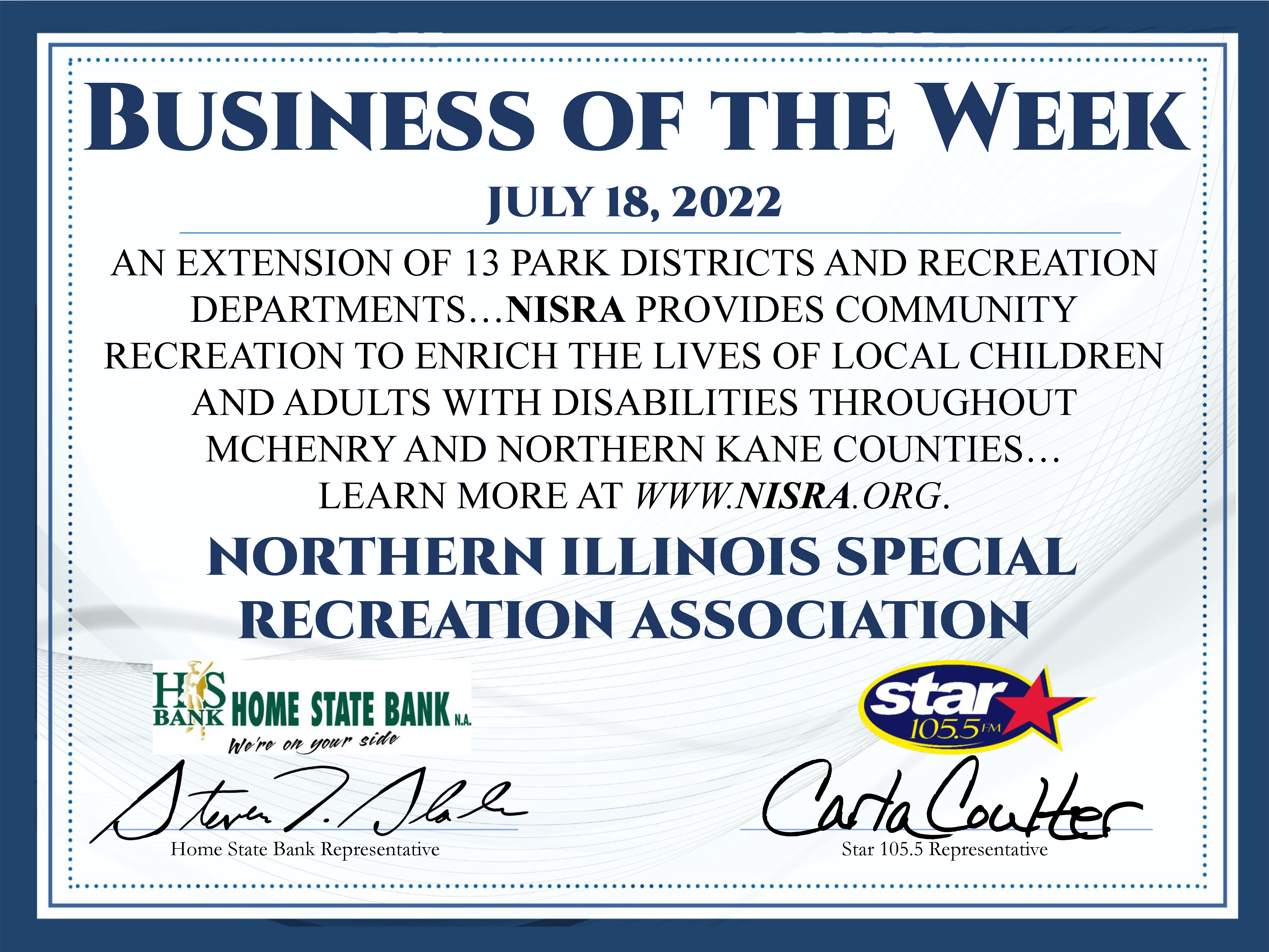NISRA has been named Home State Bank’s “Business of the Week”! Tune into Star 105.5 beginning July 18 between 6:00 am and 10:00 am to hear our radio commercial live.